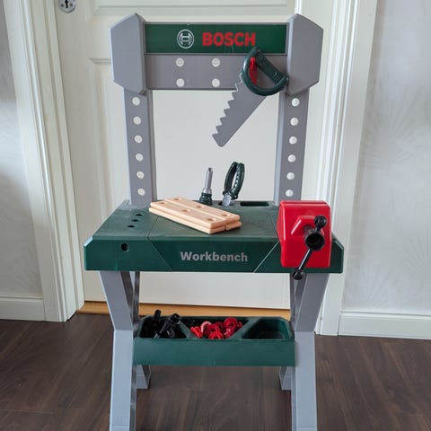 Denna underbara verktygsbänk i orginal Bosch-design är utrustad med en lång rad verktyg, så som hammare, såg, fil, vattenpass, skurvstäd, vinkelhake, tving och skruvmejsel. Utöver verktygen är arbetsbänkens lådor fulla av muttrar, skruvar, bultar, kugghjul och fästplattor i olika längder. Låt fantasin flöda!