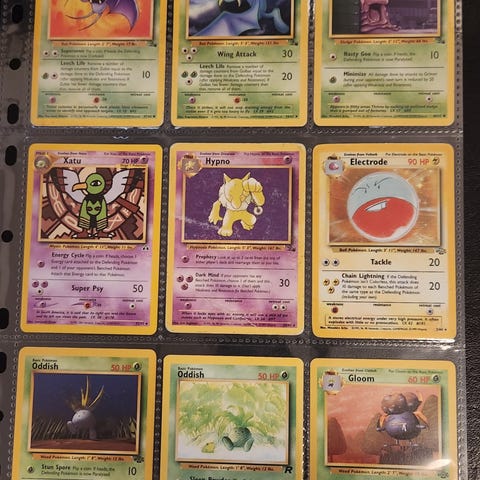 Pokémon kortsamling med blandade samlarkort. Bilden visar flera olika Pokémon-kort i en plastficka, bland annat vatten-, eld- och gräskort från olika serier. Korten är i standardstorlek för samlarkort och kan användas för spel eller samling. Ingen ytterligare information om upplagor eller exakta set anges.