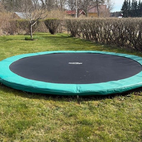 Kvalitetsstudsmatta inköpt för 10 år sedan. Mått 4,2 x 2.9 meter. Rejält vadderat kantskydd och högt skyddsnät Bra skick. Duken bytt på garantin. Ej använd de senaste 3 åren och nedmonterad och har därför inga bilder.