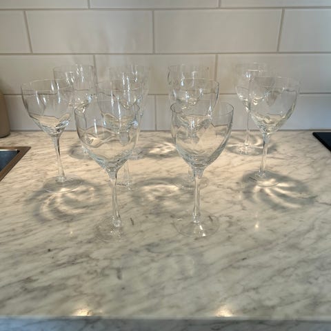 Jättesnygga glas från Fyrklövern Drop med ljusgrå nyans på foten, 6 st. Helt nya, aldrig använda. Rymmer 55 cl, höjd 22. Nypris: 900:-