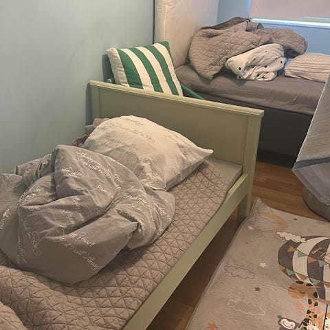IKEA enkelsäng för barn, 80cm bred. Sängen är klädd i ett ljust grått tyg och har ben i trä. Passar som barnsäng eller juniorsäng i sovrum. Bäddmadrass ingår.