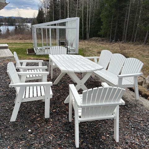 Trädgårdsgrupp bord bänkar och stolar vit trä