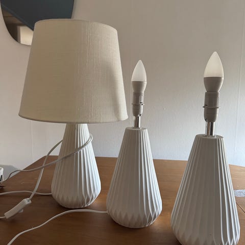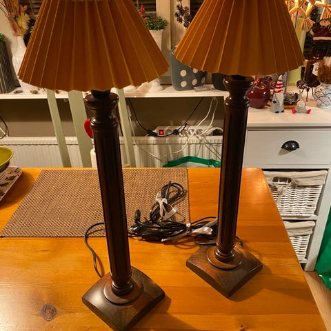 Två bordslampor i okänt märke med fot i mässingsfärgad metall och tygskärmar i gul ton. Lampskärmarna har klassisk form med dekorativ frans nedtill och tygklädd knopp upptill. Lamporna är eldrivna med vit sladd och strömbrytare.