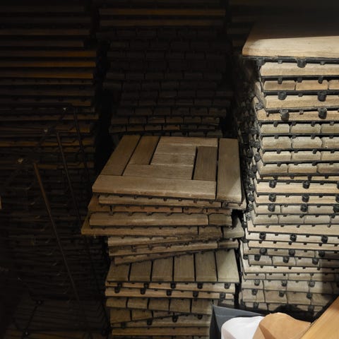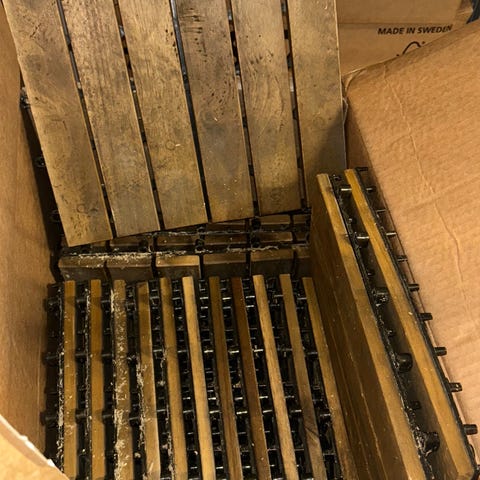 52 st trallplattor, varav 4 syns på bilden, säljes pga flytt. Varje platta är 30 x30 cm och totalt blir det 4,7 kvm. Enkelt att sätta ihop. De liknar Ikeas plattor Runnen. Plattorna är i gott skick men färgen har bleknat så de är mer gråbruna än nya plattor som är mer rödbruna.