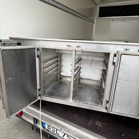 Blandat parti storköksutrustning i rostfritt stål. Paketet omfattar bland annat en större kyl- eller frysbänk på hjul, en degblandare med rostfri skål, ett vattenbad eller värmebad på vagn med dubbla hoar samt en större stekhäll eller grillplatta i rostfritt stål. Utrustningen är avsedd för professionellt kök, restaurang eller café och lämpar sig för tillagning, uppvärmning och förvaring av mat. Alla enheter är fristående och anpassade för användning i kommersiella miljöer.