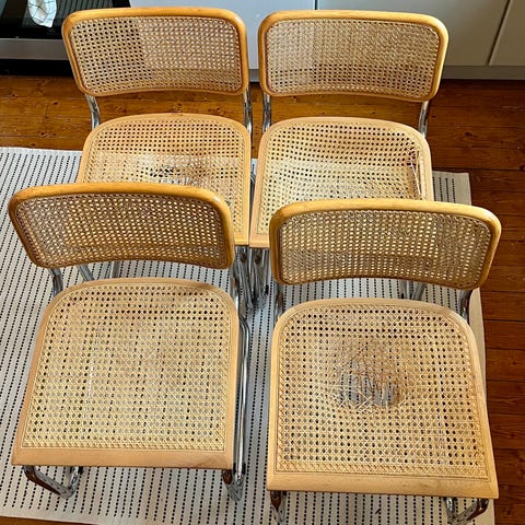 Medföljer också 2 st stolar med rottingsits. Tyvärr har ena rottingsitsen börjat gå sönder lite och stommen på den andra stolen är böjd.