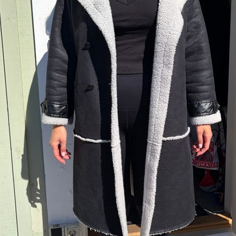 Svart kappa med en elegant omlottdesign framtill som skapar en flytande och smickrande silhuett. Kappan har långa ärmar och en medellång skärning som faller strax ovanför knäna. Den är designad utan knäppning för en öppen och avslappnad passform, vilket gör den mångsidig för olika tillfällen.