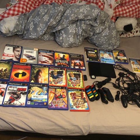 Ps2 inklusive handkontroll, kablar, 9 st spel, originalkartong och manual.