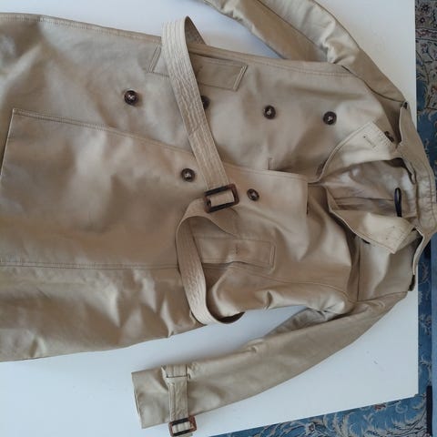 Stradivarius kappa för dam i storlek M. Kappan är blå och tillverkad i bomull. Modellen har dubbelknäppning framtill, avtagbart midjebälte och knäppbara remmar vid ärmsluten. Längden går ned över höfterna och ryggen har en dekorativ slejf. Passar som ytterplagg under vår och höst.