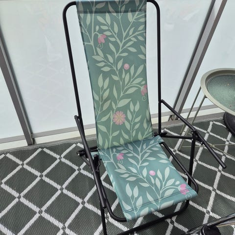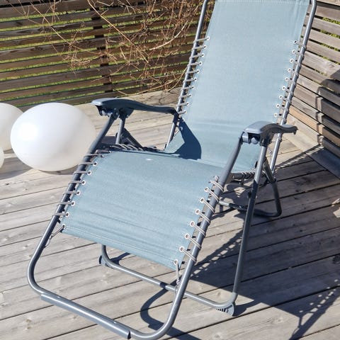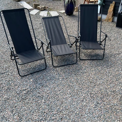 Hopfällbara solstolar i svart textil med metallstomme. Stolarna har hög rygg och sits i slitstarkt tyg som är spänt över en ram i metall. Konstruktionen gör dem enkla att fälla ihop för förvaring eller transport. Passar för användning på balkong, altan, trädgård eller camping där man vill ha en enkel sittplats utomhus.