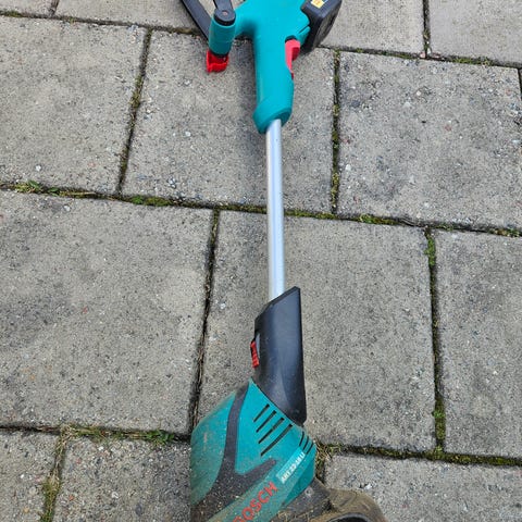 Elektrisk grästrimmer med teleskopskaft och bärrem. Modellen har främre stödhandtag för bättre kontroll och justerbar längd på skaftet för att passa olika användare. Avsedd för trimning av gräskanter och mindre ytor i trädgården. Strömanslutning via elkabel (ej batteri).