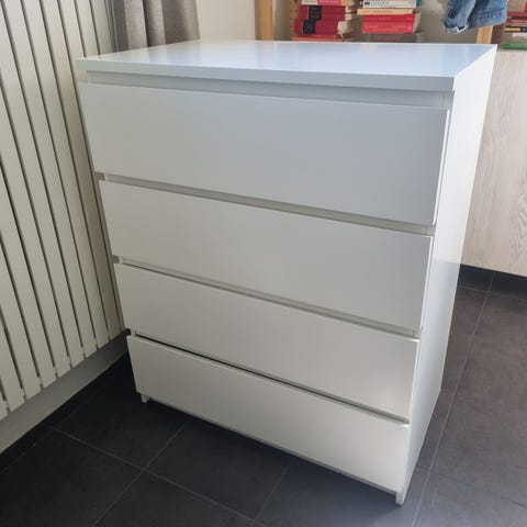 IKEA malmbyrå med fyra lådor. Ena lådfronten är av men går att fixa lätt för den som är händig.