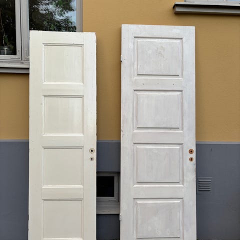 Innerdörr i trä i brun färg. Dörren har enkel, slät design, guldiga handtag är också med.
