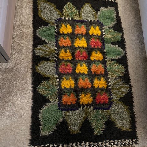 Gul ryamatta i använt skick. Uppfransad i ena hörnet, se bild.