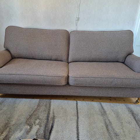 Brun tresits soffa med tygklädsel. Soffan har tre sittdynor och tre ryggdynor samt armstöd på båda sidor. Den står på ben med hjul framtill, vilket underlättar förflyttning. Passar som vardagsrumssoffa för flera personer och kan kompletteras med lösa prydnadskuddar efter behov.