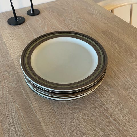 Säljer nu delar ur den tidlösa serien Isolde från svenska Rörstrand. Designad av Jacqueline "Jackie" Lynd på 1970-talet. Tallrikarna har en härlig rustik känsla med sitt karaktäristiska bruna band mot den spräckliga ljusa glasyren.