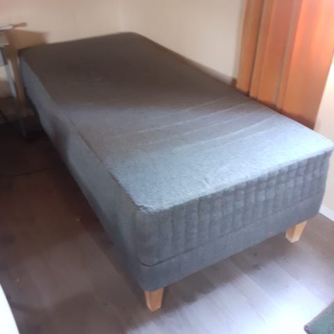 IKEA resårbotten säng i grått tyg. Sängen står på runda ben i metall. Passar som enkelsäng i sovrum, gästrum eller tonårsrum.