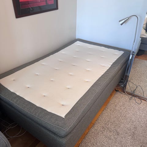 Mio säng i grått tyg med tillhörande sänggavel och bäddmadrass.