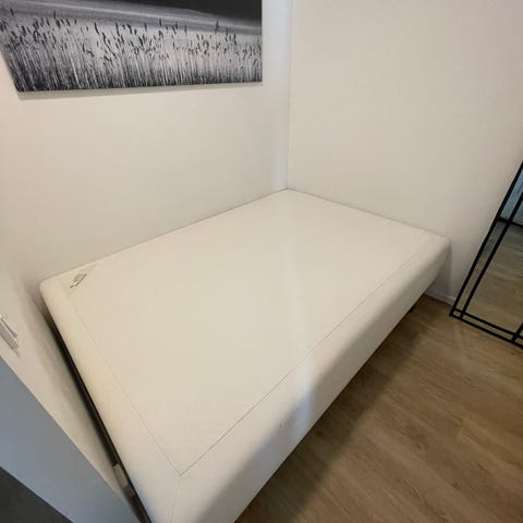 En 140x200 cm resårbotten med bäddmadrass, madrasskydd och ben, från IKEA