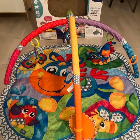 Babysitter med avtagbar klädsel i grått tyg och enkel stomme. Babygym som går att tvätta. Inga djur finns i hemmet och bra skick på allt.