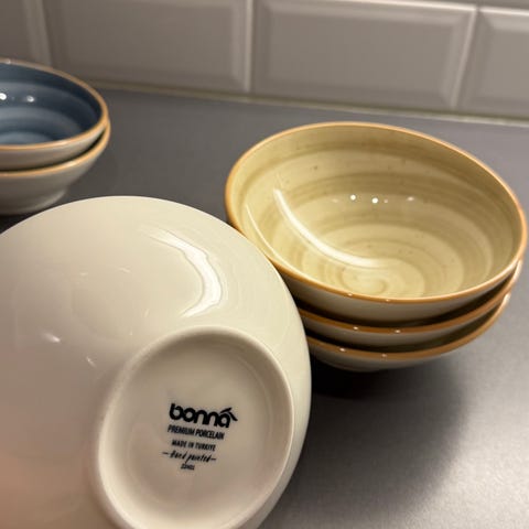 Bonna skålar i keramik. Setet består av skålar i två olika färger, beige och blå, med vit utsida. Passar för servering av exempelvis frukost, soppa eller snacks.