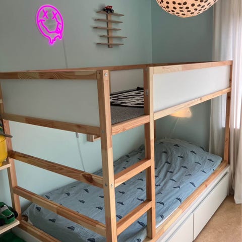 Våningssäng som också kan delas till två separata sängar. Tillhörande förvaringslådor. Dessa behöver förstärkas.