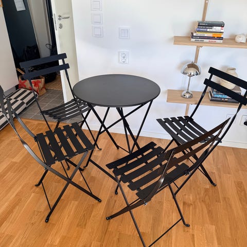 Fyra stolar och ett runt bord från Fermob, serien Rendez- vous. Metall. Färgen är nutmeg med lite glitter i färgen