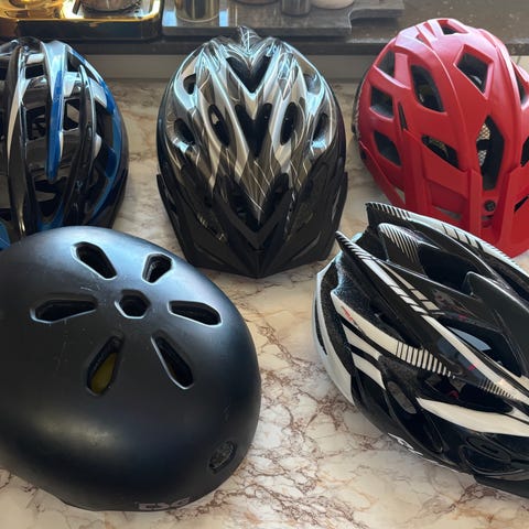 Cykelhjälmar i olika storlekar för juniorer och mindre barn. En av hjälmarna kan vara en vuxenhjälm i storlek S/M.