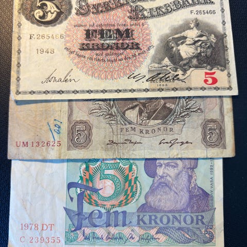 Sveriges Riksbank äldre sedlar 5 och 10 kronor