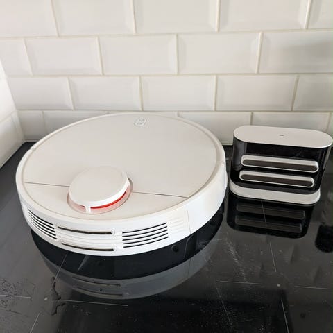 Roborock robotdammsugare i vit färg. Rund modell med laddstation. Utrustad med roterande borste undertill samt sidoborstar för rengöring av golv. Dammsugaren har öppningsbart lock upptill för åtkomst till dammbehållare och filter. Passar för dammsugning av hårda golv och låga mattor i hemmet.