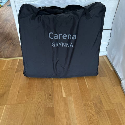 Carena Grynya resesäng för barn. Sängen levereras i en bärväska med handtag för enkel transport och förvaring. Passar som extrasäng eller sovplats vid resor och övernattningar. Material och exakta mått framgår inte av uppgifterna.
