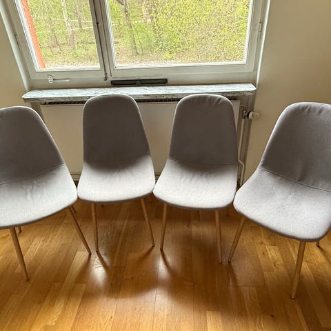 Fyra stycken fina Jonstrup stolar grått tyg. Ben är natur/ekfärgade, stolar bredd 45 cm, höjd 87 cm, djup 53 cm, sitthöjd 46 cm. Vadderad sits , ryggstöd med klädsel av tyg. Ben i stål som ser ut som ekträ. Se bild med spec.info från Jysk. Vikt 4,5 kg per stol. Ben med ställning skruvas av från sits/ryggdel innan hämtning. Hämtas. Möter på offentlig plats i centrala Gbg. Inte vid centralen.