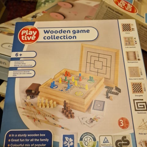 Praktiskt 3-i-1 spel med schackbräde på utsidan och backgammon på insidan. Innehåller spelpjäser och tärningar.