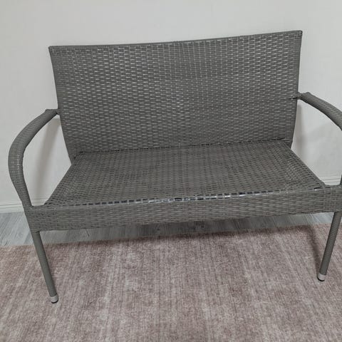 Tvåsitsig träsoffa för utomhusbruk i brun färg. Bänken har ribbad sits och ryggstöd samt armstöd på båda sidor. Passar fint på balkongen, altan eller uteplatsen. Tack vare ribborna kan regnvattnen lätt rinna bort. Välskött.