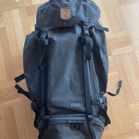 Fjällräven Kajka ryggsäck i svart färg. Stor vandrings- och trekkingryggsäck med toppmatat huvudfack, flera ytterfack och lockfack. Justerbart bärsystem med vadderade axelremmar, bröstrem och höftbälte för jämn viktfördelning. Kompressionsremmar på sidorna hjälper till att stabilisera packningen. Passar för längre vandringar och resor där mycket packning behöver bäras bekvämt.