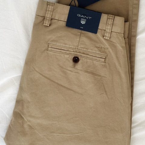 Ett par byxor från Gant i slim fit-modell. Byxorna har hällor för bälte, två fickor framtill och två passpoalfickor baktill med knappar. Gylfen stängs med dragkedja och knapp. Byxorna är nya med etiketter kvar.