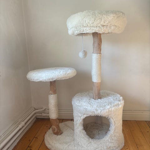 Passa på att fynda! Knappt använt Trixie Penelope klösträd i storlek 50x40x105 cm i beige färg. Klösträdet har flera liggplatåer och en rund sovplats högst upp. Stolparna är klädda för att katten ska kunna klösa. Passar för inomhusbruk till en eller flera katter som behöver klösmöjlighet, vila och aktivitet på olika nivåer.