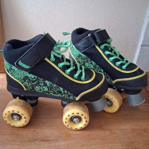 Crivit rullskridskor för barn i storlek 31. Klassiska fyrhjuliga rullskridskor med vit ovandel, rosa mönsterdetaljer och turkosa remmar samt rosa skosnören. Hjul i lila och rosa ton. Justerbart kardborreband över vristen för bättre passform. Lämpliga för barn som vill åka rullskridskor utomhus eller inomhus på slät yta. Frambroms på båda skorna för säkra stopp.