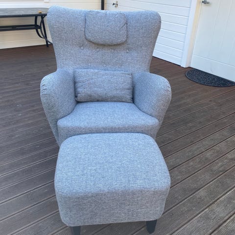 Fin och bekväm fåtölj med fotpall från Mio med bra sitthöjd och armstöd, lätt att ta sig i och ur. Säljes pga flytt. Nypris ca 3600 kr.