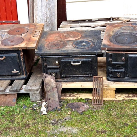 Vedpannor/kökspannor i gjutjärn i svart utförande. Spisen har övre lucka för eldstad och nedre lucka för askuttag. Ovanpå finns en plan yta med rund platta för eventuell matlagning eller uppvärmning av kärl. Passar för uppvärmning av mindre utrymmen där vedeldning är möjlig och godkänd. Tre tusen för båda.