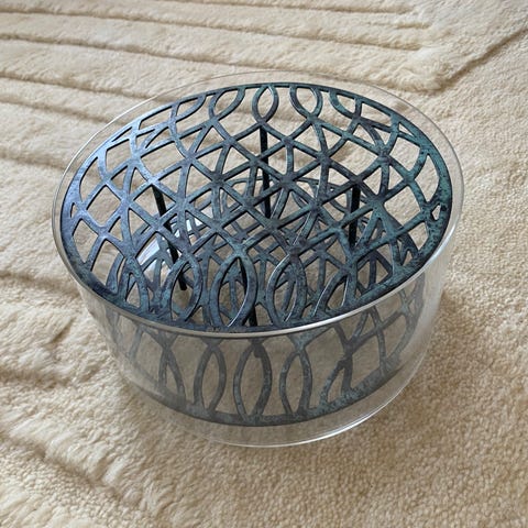 Storleken: 21 cm i diameter och 10 cm hög med insats i mässingston. Cylindrisk form med genombrutet mönster i metall som kan användas som stöd för blommor eller dekoration.
