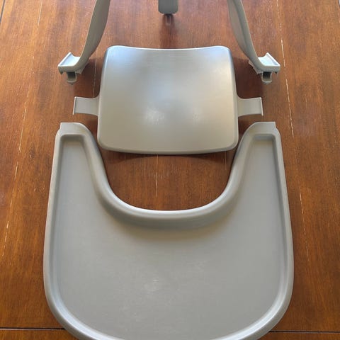 Babysetet består av ryggstöd och bygel i plast som monteras på Tripp Trapp-stolen för att ge extra stöd till mindre barn som kan sitta själva.