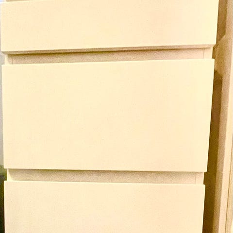 IKEA byrå i vit färg. Byrån har flera lådor för förvaring. Översta delen verkar ha en uppfällbar sektion med spegel och förvaringsutrymme under locket, vilket kan användas till exempel som smyckes- eller sminkförvaring. Passar i sovrum, hall eller andra rum där extra förvaring behövs. Utförande i slät, vit yta med raka linjer.