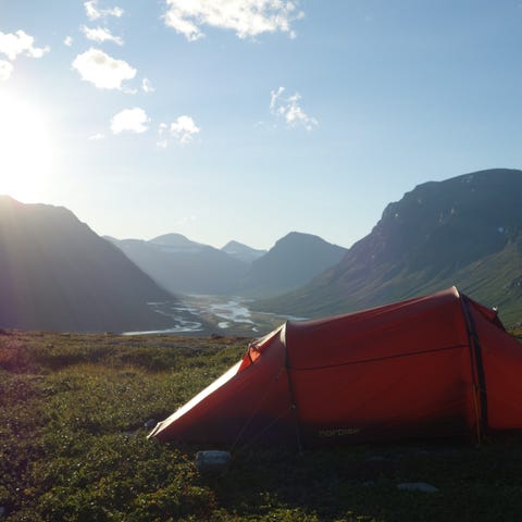 Rött tunneltält lämpligt för användning i vinter- och snöförhållanden. Tältet har bågar som ger en långsträckt tunnelkonstruktion och flera fästpunkter för stormlinor. Passar för övernattning utomhus vid vandring, turskidåkning eller annan friluftsaktivitet där skydd mot vind och snö behövs.