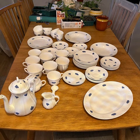 Gustafsberg porslinstallrikar och skålar i brunvit färg. Servisen består av flata tallrikar, djupa skålar samt en mindre serveringsform med handtag. Utsidan är brun medan insidan är vit. Delarna är märkta Gustafsberg Sweden på undersidan. Passar för servering av vardagsmat, soppor, grytor och desserter i kök och matsal.