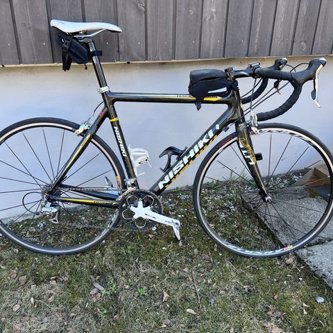 En Giant TCR Team. Välanvänd landsvägscykel. Jag tror det är storlek 56. Jag är 177 cm och det funkar bra. Framgaffel och sadelstolpe i kolfiber. Ksyrium elite hjul med ok continentaldäck. Shimano Dura ace vevparti. Ramen är sliten.