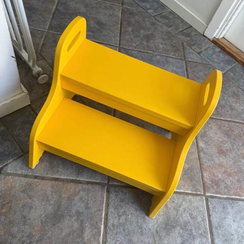 Ikea barnpall i två steg i gul färg. Pallen är utformad för barn och har två trappsteg med sidor som ger stöd.