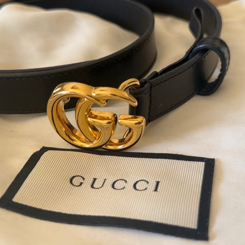 Gucci GG skärp för kvinna i svart läder. Skärpet har ett guldfärgat GG-spänne framtill. Tillverkat i läder med klassisk design som passar till både vardag och mer uppklädda tillfällen. Lämpligt att användas i hällor på byxor eller som midjeskärp över klänning eller kappa.
