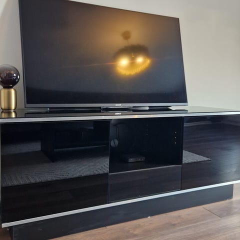 Tv-bänk i vit och grå färg med två nedre lådor för förvaring. Passar att placeras mot vägg under väggmonterad tv. Utförd i träbaserat material med slät, modern design. En av lådorna är seg att stänga ibland men är man händig kan man säkert fixa det.