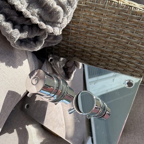 Spolknapp spolplatta för toalett i kromfärgad metall. Plattan har två runda knappar för dubbelspolning och är avsedd att monteras utanpå väggen på en inbyggd cistern. Baksidan har två mekaniska tryckenheter och fästhål för montering. Passar som reservdel eller utbyte av befintlig spolplatta med liknande mått och infästning.